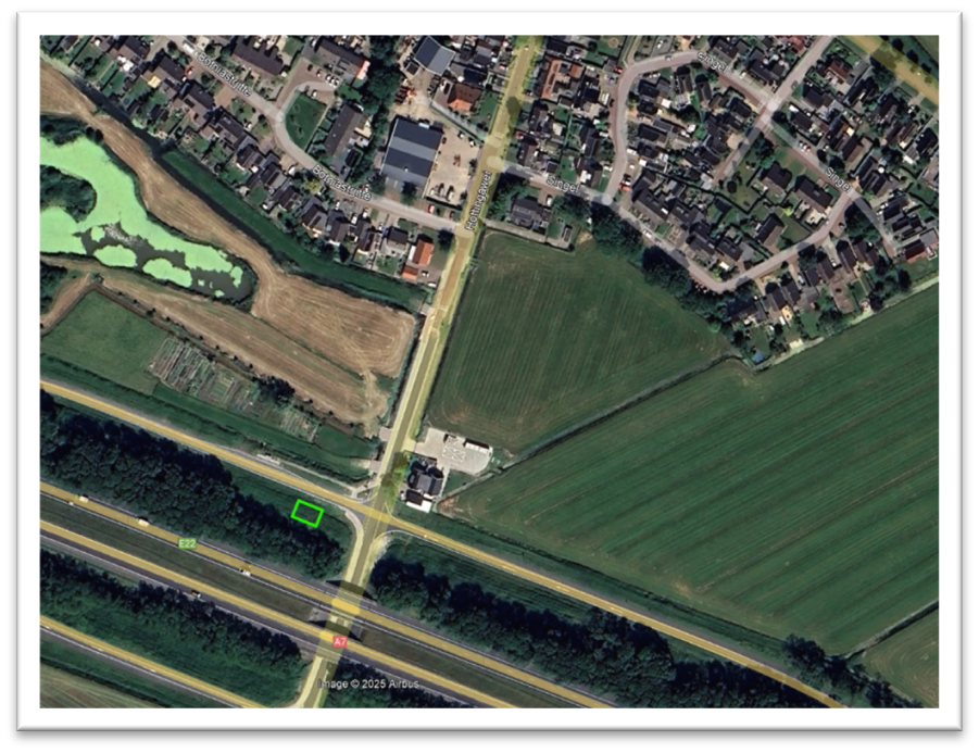 Het voorstel is om de antennemast te plaatsen bij de oprit A7 richting Bolsward, zie groen rechthoek: